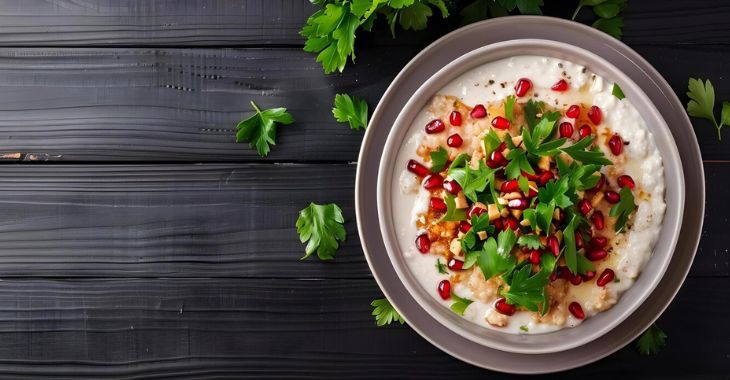 - Curd Rice with Pomegranate – Bowl with white curd rice and red seeds
